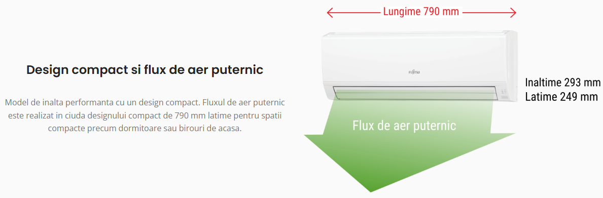 Desi de mici dimensiuni, lungimea aparatului fiind de doar 79 de centimetri, fluxul de aer de care dispune acesta este unul puternic, obtinut cu ajutorul unui schimbator de caldura, precum si prin utilizarea unui ventilator cu debit mare de aer si dimensiuni compacte. Puterea fluxului de aer se poate ajusta.