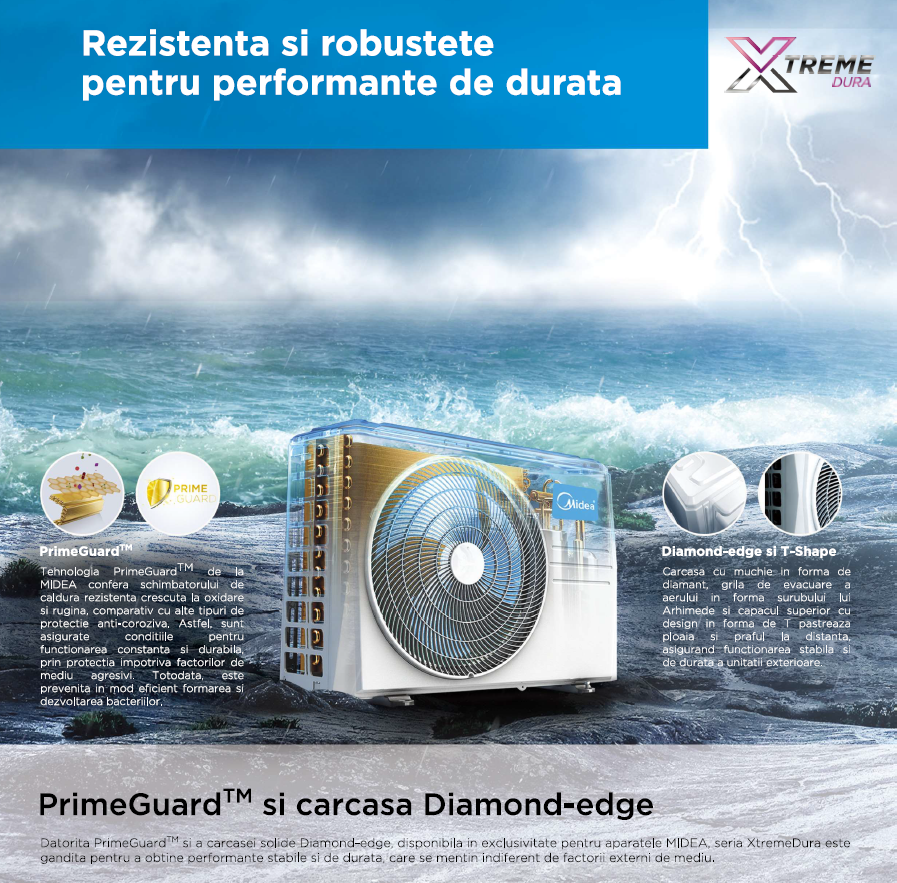 Tehnologia PrimeGuardTM de la MIDEA confera schimbatorului de caldura rezistenta crescuta la oxidare si rugina, comparativ cu alte tipuri de protectie anti-coroziva. Astfel, sunt asigurate conditiile pentru functionarea constanta si durabila, prin protectia impotriva factorilor de mediu agresivi. Totodata, este