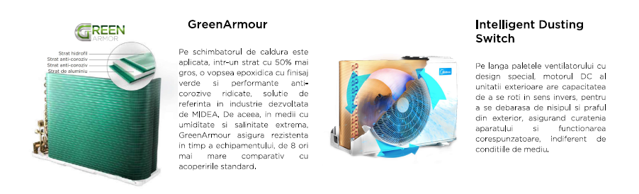 Pe schimbatorul de caldura este aplicata, intr-un strat cu 50% mai gros, o vopsea epoxidica cu finisaj verde si performante anti-corozive ridicate, solutie de referinta in industrie dezvoltata de MIDEA. De aceea, in medii cu umiditate si salinitate extrema, GreenArmour asigura rezistenta in timp a echipamentului, de 8 ori mai mare comparativ cu acoperirile standard.